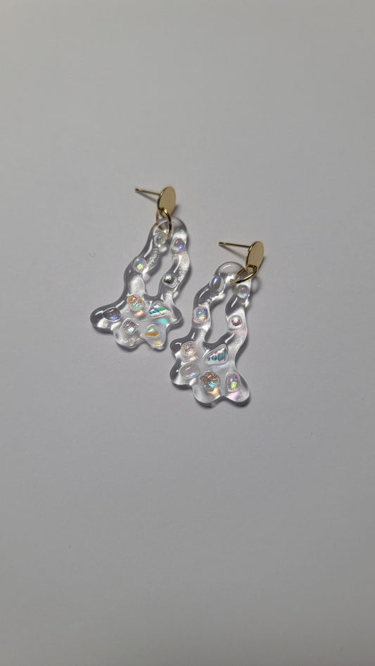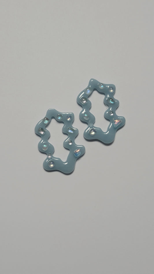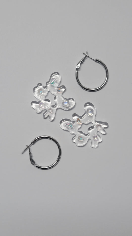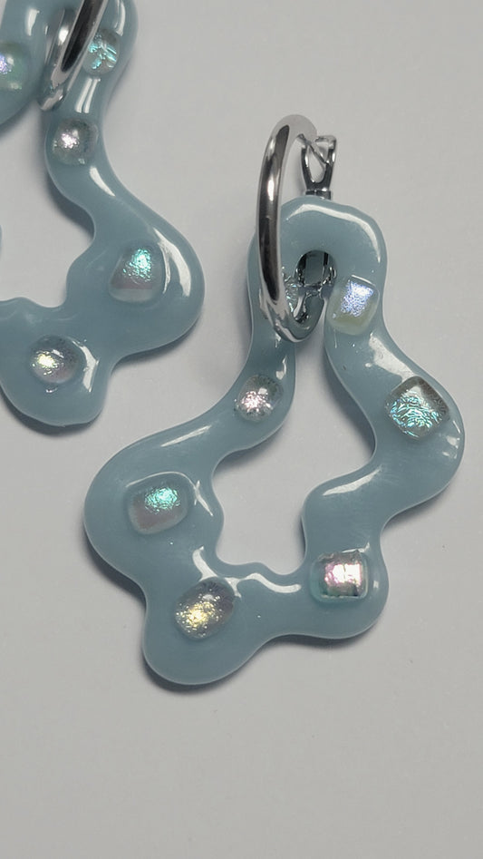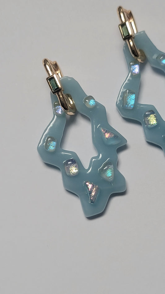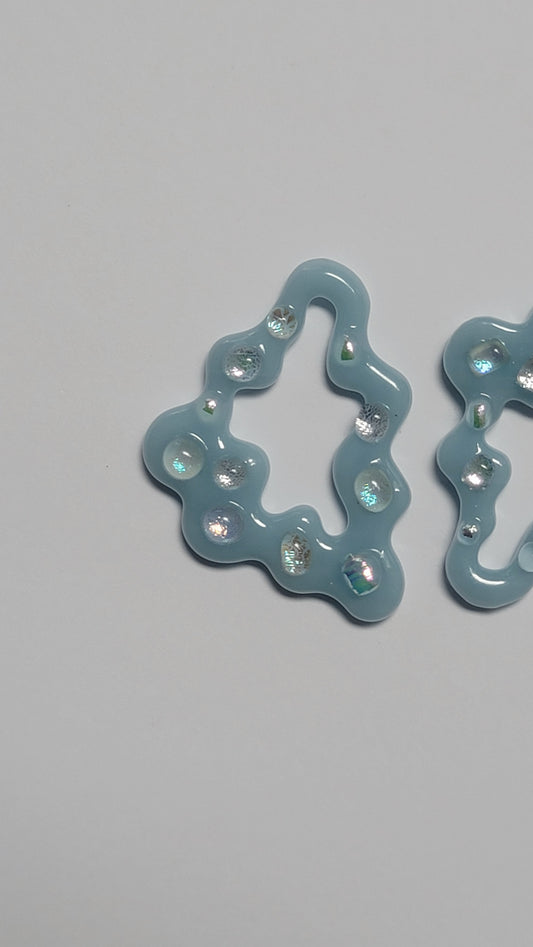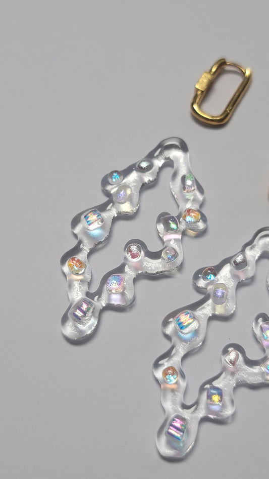 El vidrio aquí se transforma en pequeñas esculturas para llevar y objetos que habitan el hogar. Predominan los aretes, piezas ligeras y expresivas, junto con algunas creaciones decorativas.