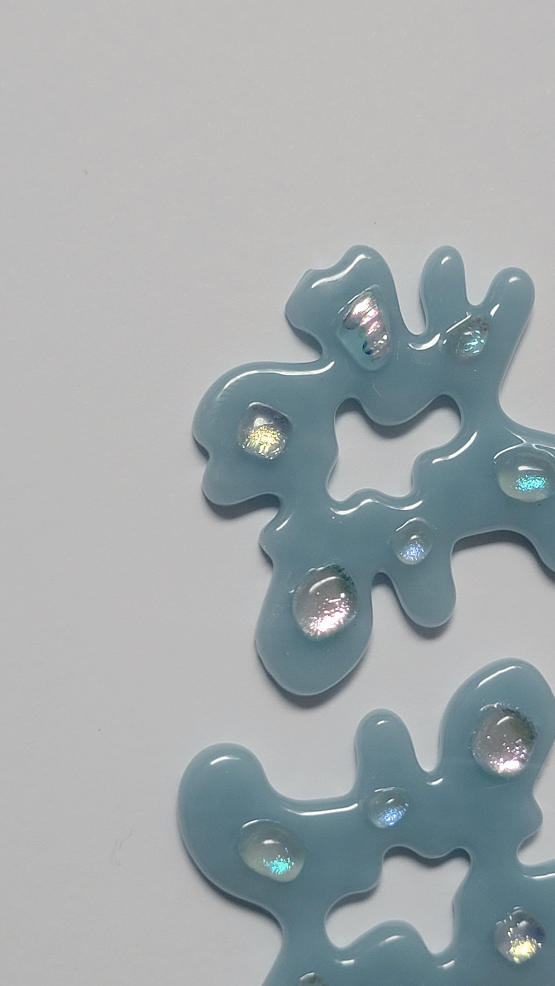Encontrarás piezas en vidrio transparente y en Dusty Blue, un azul empolvado que captura la esencia del invierno. Aretes pensados para acompañarte en los días fríos, aportando luz, calma y elegancia.