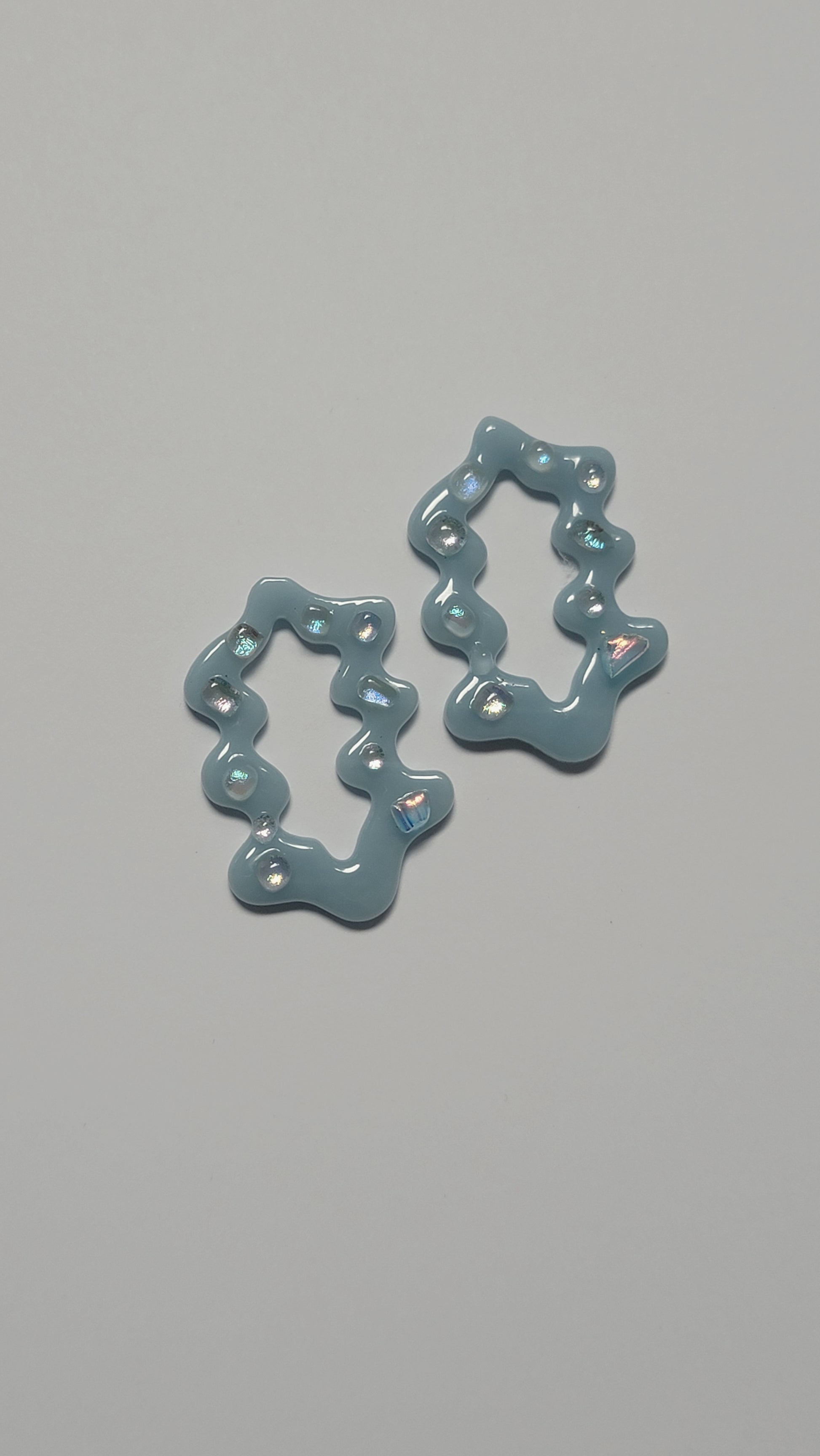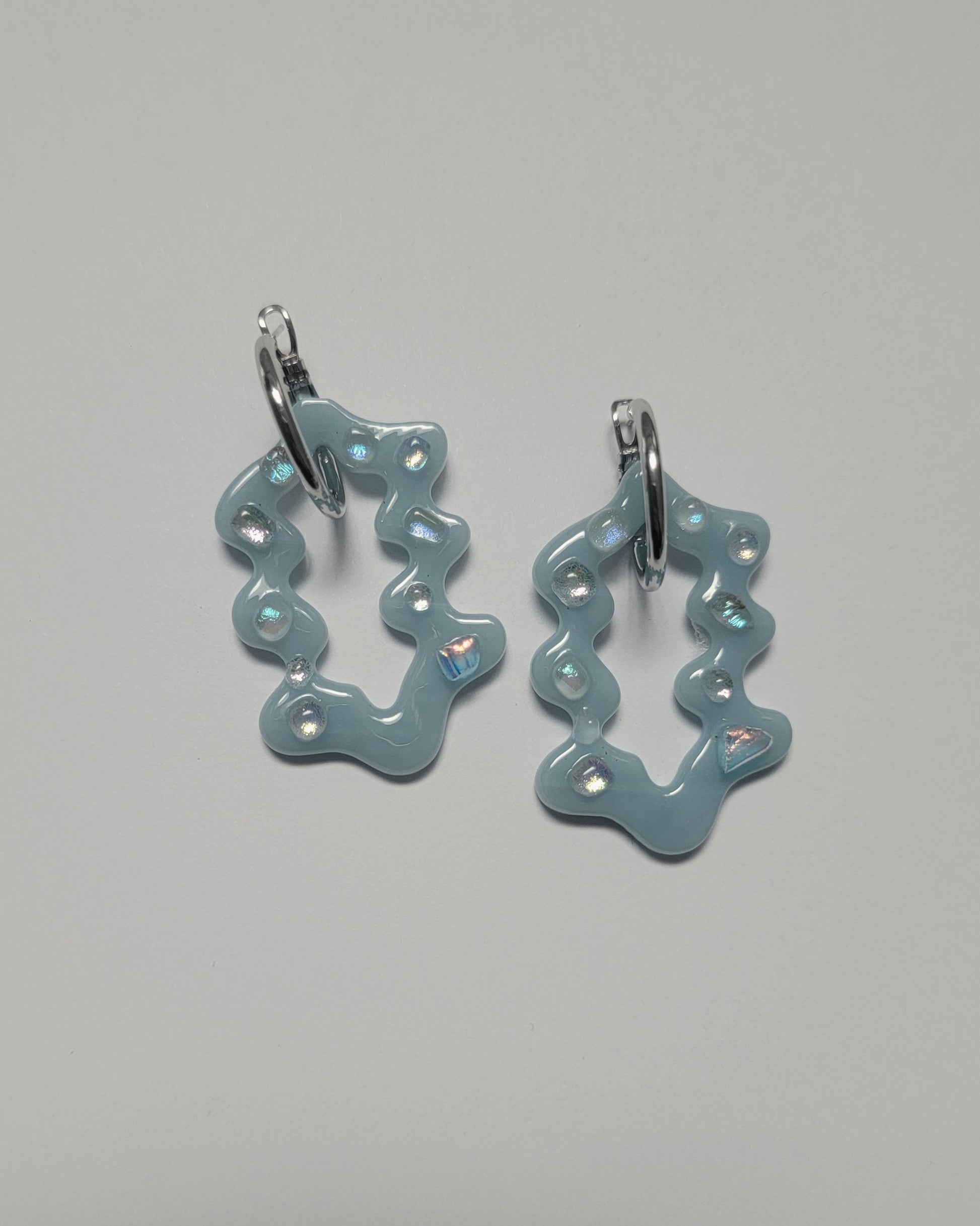 Encontrarás piezas en vidrio transparente y en Dusty Blue, un azul empolvado que captura la esencia del invierno. Aretes pensados para acompañarte en los días fríos, aportando luz, calma y elegancia.
